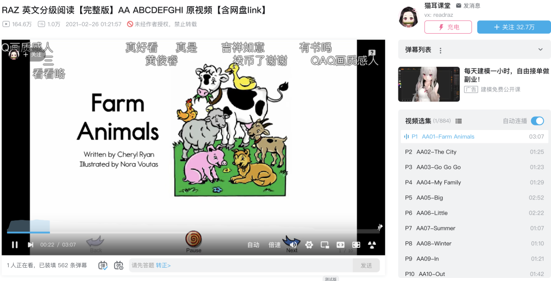 B站上的英语资源特别多,比如分级阅读大神RAZ,原网站不仅要付费,而且网速极慢,B站有网友直接免费上传了从AA到Z一共29个等级,共880+集,4岁到11岁的英语启蒙都在这里了!