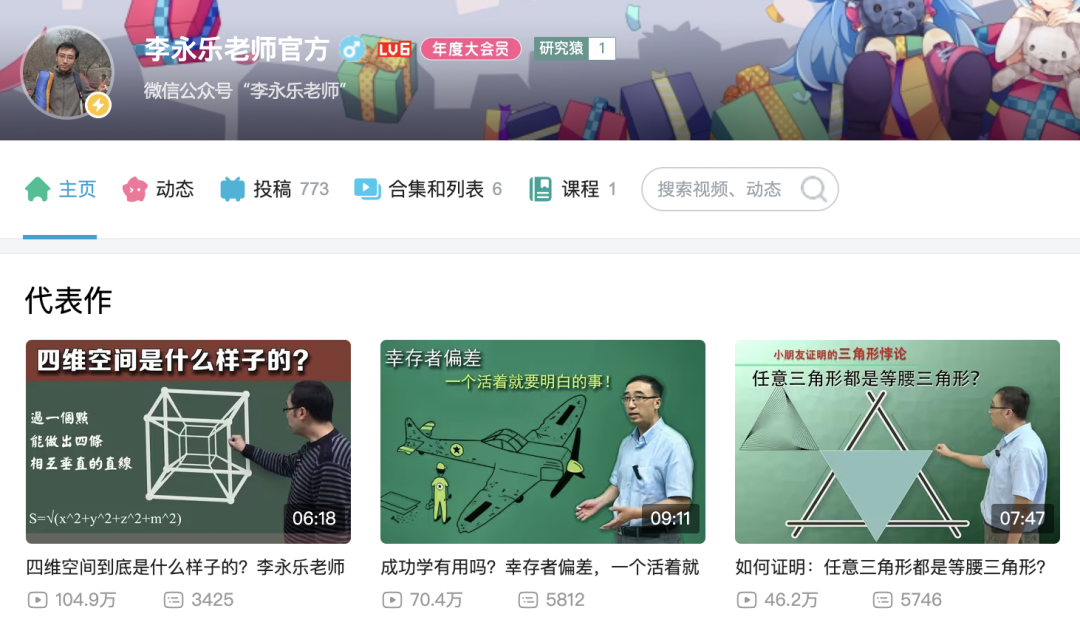 李永乐老师是人大附中老师主要教物理和数学,用业余时间制作物理、化学、数学教学视频,种类五花八门都讲的很有意思。