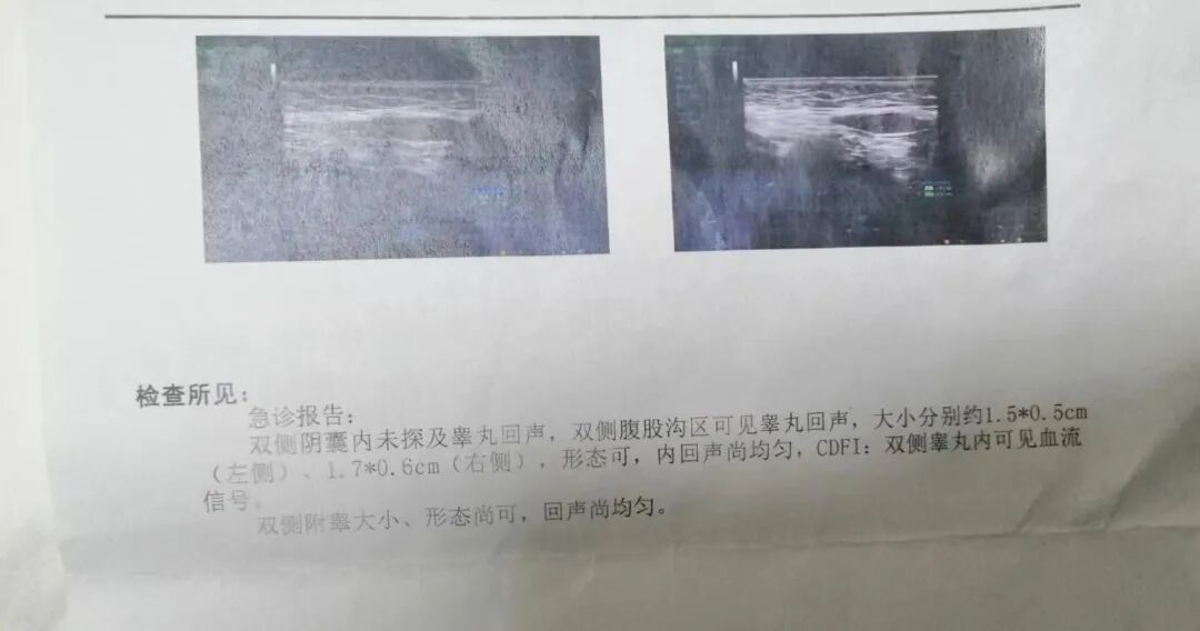 检查完毕,医生说:“宝宝的双侧睾丸都不在阴囊里边,跑到腹股沟去了,怀疑是隐睾,做个超声确认一下吧。”随即开了超声检查单。