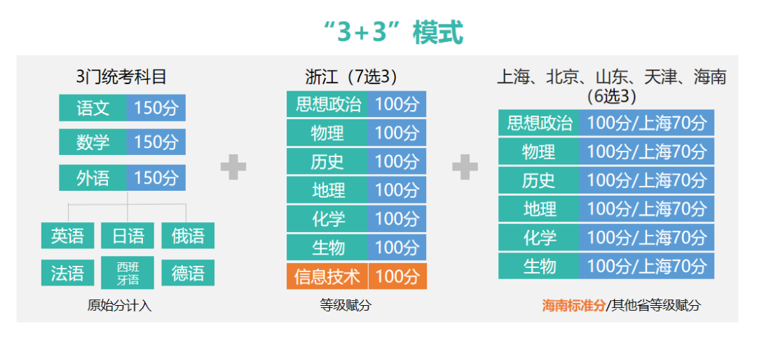目前采用3+3模式的省市有:浙江、上海、北京、山东、天津、海南。“3”指的是:语文、数学、外语,这三门科目考试参加统一高考,由教育部考试中心统一命题,以原始成绩计入考生总成绩;