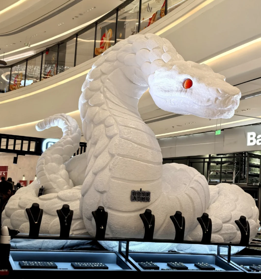 今年山东青岛某商场内品牌祭出的白色巨蟒,便是遵循此逻辑设计出的潮哥打卡单品,你得承认它确有几分霸气。