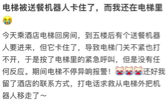送餐机器人,还有啥槽点?大家在社交平台上对送餐机器人的吐槽,不止“C位强迫症”这一个。因为重心不稳、地形崎岖、地毯褶皱等等原因,总之机器人还挺容易卡住和摔倒的,耽误送餐、卡在电梯口就算了,更可怕的是半夜摔倒后,整个酒店走廊都绵延着“救救我”的喊声;