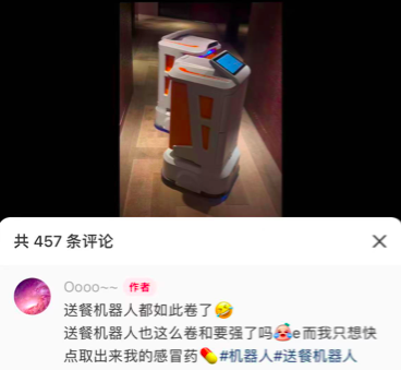 槽点直击要害,但喜欢它的人也不在少数。有人专挑有机器人的酒店住,不用下楼拿外卖,也不用衣冠整齐地开门和外卖骑手打照面;