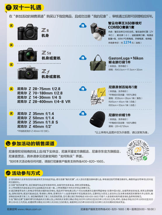 2025年10月9日至11月20日尼康“缤纷光影,钜惠好礼”双十一惊喜促销活动即将启幕。活动期间,凡通过指定销售渠道购买尼康Z8机身、Z5Ⅱ、Zf机身或套机及部分尼克尔镜头的用户,完成“我的尼康”微信小程序注册并通过审核,即可依据所购产品获赠智云功率王X60影视灯COMBO套装、GastonLuga×Nikon联名旅行袋、尼康针织帽、尼康原创百贴布等专属好礼。