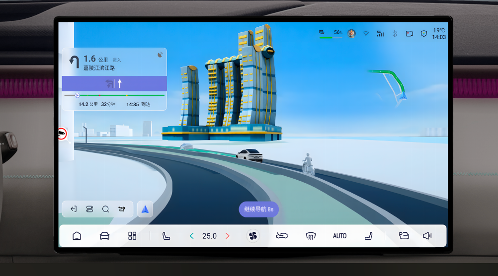 基于强大算力,深蓝L06行业首发四图融合实景车道级导航。并依托15.6英寸2.5K超高清向日葵屏与50英寸AR-HUD全息式增强现实系统,将基础导航、车道级导航、SR渲染与环境重构融为一体,一屏显示全部导航与驾驶辅助信息,真正实现 “不分屏、不分心” 的沉浸式导航体验。