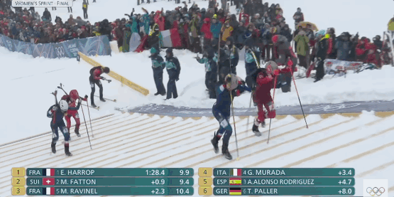 世锦赛三冠王、身穿蓝衣头戴灰粉色头盔法国名将埃米莉·哈罗普无疑是女子短距离比赛的夺冠最大热门,第一赛段和第二赛段的配速都遥遥领先,但是在转换区穿板时她出现了明显失误,被瑞士选手、世锦赛双冠王,身穿红衣脚踩黄色雪板的玛利亚内-法顿超越。