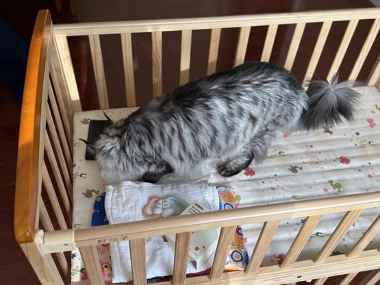 家里的猫猫正在检查刚刚铺好的婴儿床丨作者供图