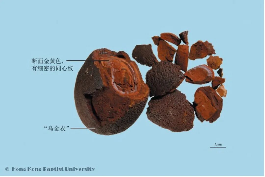 牛黄在外形上大多为不规则的卵球形,直径从0.6厘米到4.5厘米不等,少数呈管状或碎片状;其表面呈棕黄色,有时还会有一层色黑光亮的薄膜,称为“乌金衣”。牛黄量轻质脆,断面常为金黄色,切面可见同心圆状的层纹。