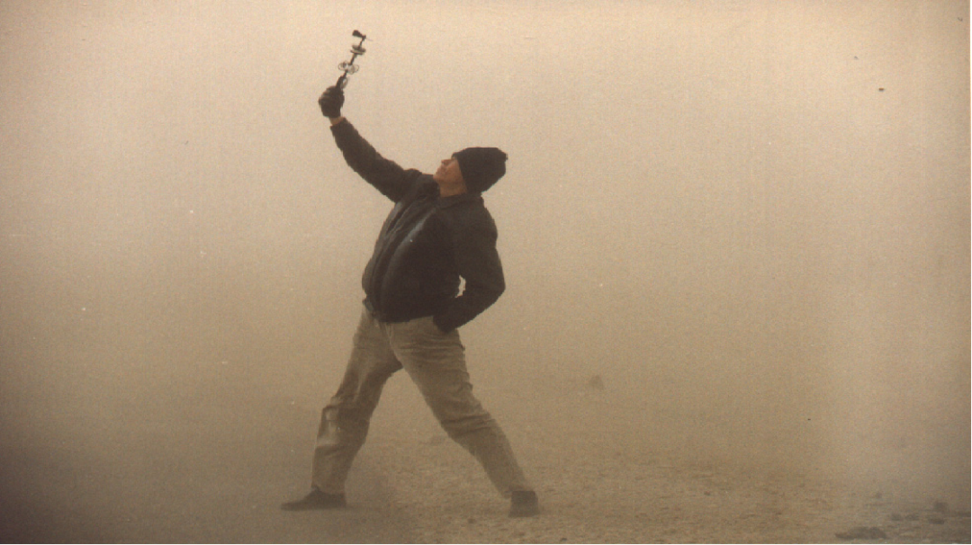 这是在2002年4月7日,我遇到了一次强沙尘天气。也就是这次,我初步领略了狂风的威力。当时风速是28m/s,相当于时速100公里。这样的狂风,刮得我基本上是无法正常站立。