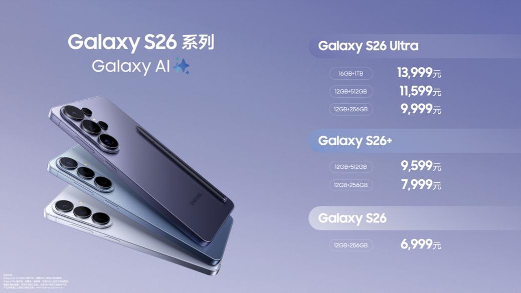 三星Galaxy S26系列提供幽夜紫、映雪白、旷宇黑与浅云蓝四款配色,以及绯霞金与镜月银两款专属色,三星Galaxy S26 Ultra厂商建议零售价9,999元起,三星Galaxy S26+厂商建议零售价7,999起,三星Galaxy S26厂商建议零售价6,999元。2月26日03点,三星Galaxy S26系列已在三星商城、三星京东自营官方旗舰店、天猫三星官方旗舰店、抖音三星官方旗舰店等线上渠道以及线下授权三星门店正式开启预约。成功预约三星Galaxy S26系列的消费者,可有机会享受加价升杯购机福利(S26 Ultra 512GB升杯至1TB 加价1600元、S26 Ultra/S26+ 256GB升级至512GB加价800元),3月5日24点前成功预约的消费者还可享有提前发货权益。