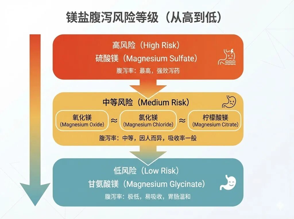 从腹泻率来说,硫酸镁> 氧化镁 ≈氯化镁 ≈ 柠檬酸镁 > 甘氨酸镁