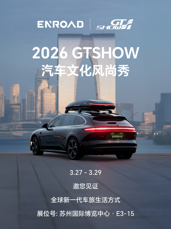 2026年3月27日至29日,全球新一代车旅生活品牌ENROAD循途将携旗下领先的智能车顶箱——漫游PRO智能车顶箱系列,亮相2026苏州 GT SHOW汽车文化风尚秀。作为“智能车旅装备”的引领者,ENROAD循途品牌将再次在GT SHOW上接受广大消费者的检验,为车旅装备行业带来全新的启示与变革。