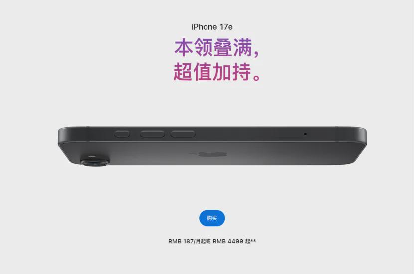 iPhone 17e官网起售价为4499元,被外界称作“目前最便宜的苹果手机”。丨苹果中国大陆官网