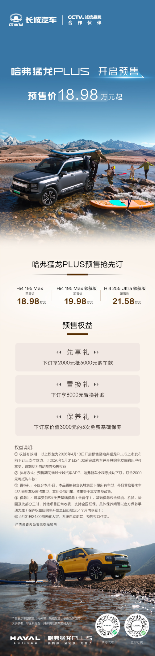入门即标配第二代Hi4智能电四驱、大空间舒享座舱及丰富的智能配置,使得猛龙PLUS在同等价格下配置远超同级,在同等配置下价格更具诚意。为回馈用户,哈弗同步推出了三重预售权益:下订享2000元抵5000元购车款的“先享礼”、至高8000元置换补贴的“置换礼”,以及价值3000元的5次免费基础保养“保养礼”,进一步降低了家庭的购车与用车门槛。